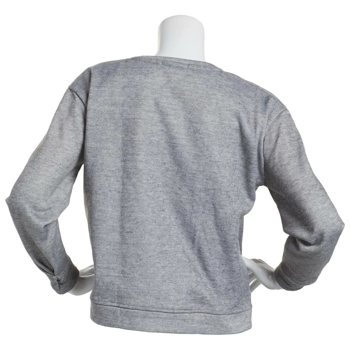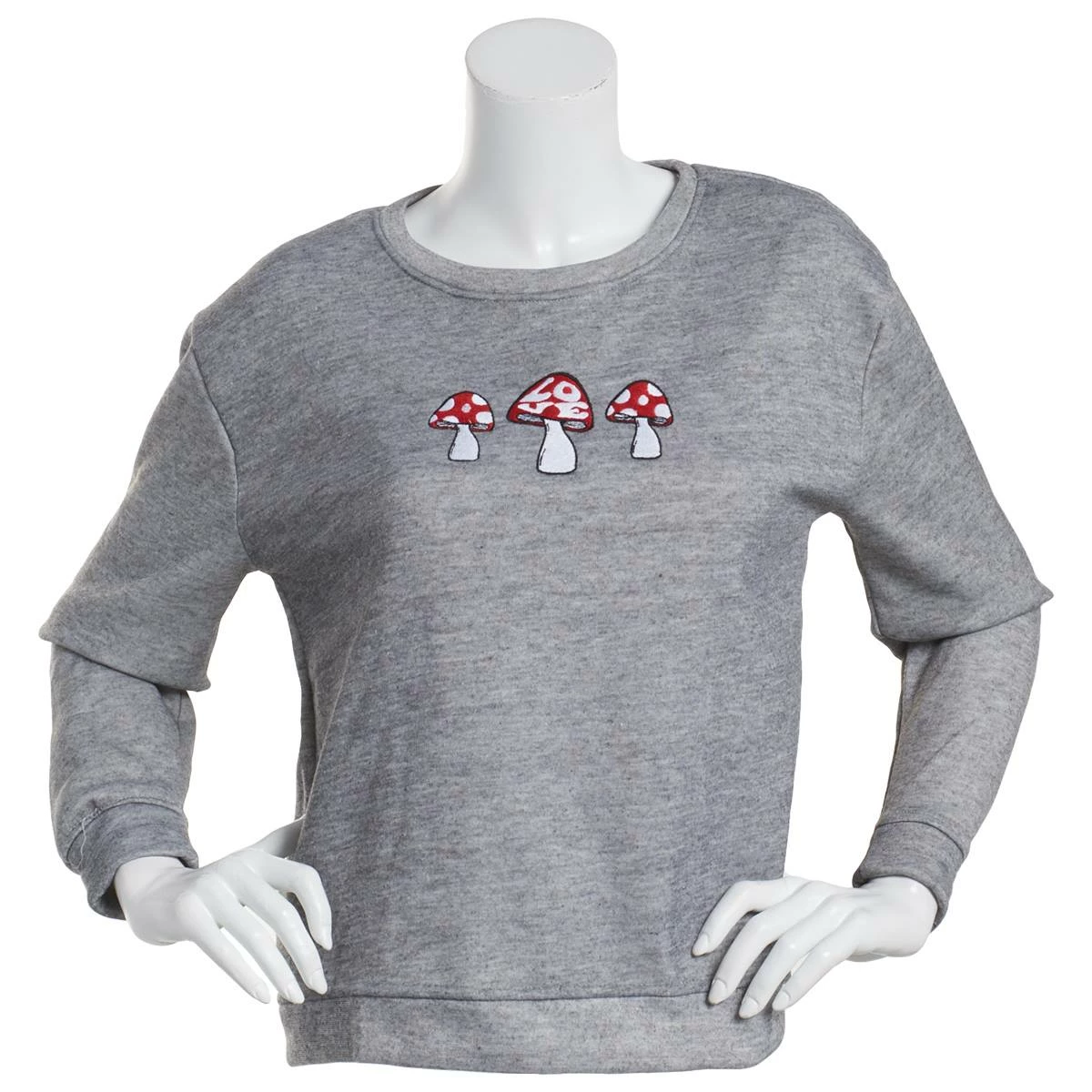 Stay warm with this Juniors Derek Heart fleece drop shoulder pullover sweatshirt that features embroidery mushrooms, long sleeves, and a crew neckline.