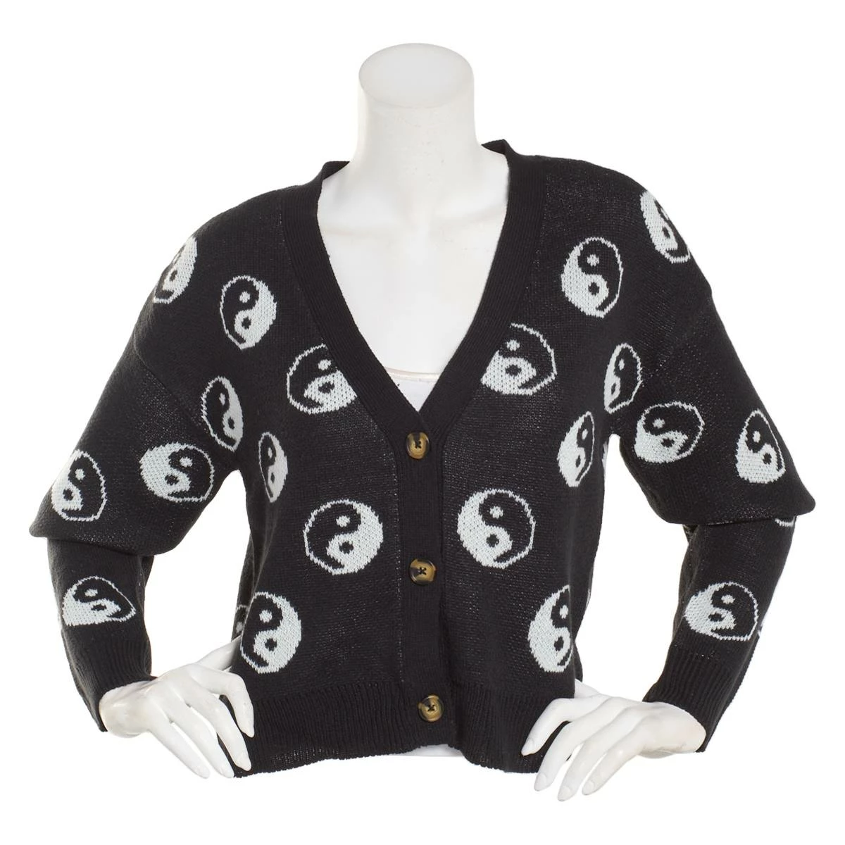 This stylish Juniors Derek Heart print crop cardigan features a v-neckline, long sleeves, and a button front. Layer this with a solid top and jeans for a nice fall look.