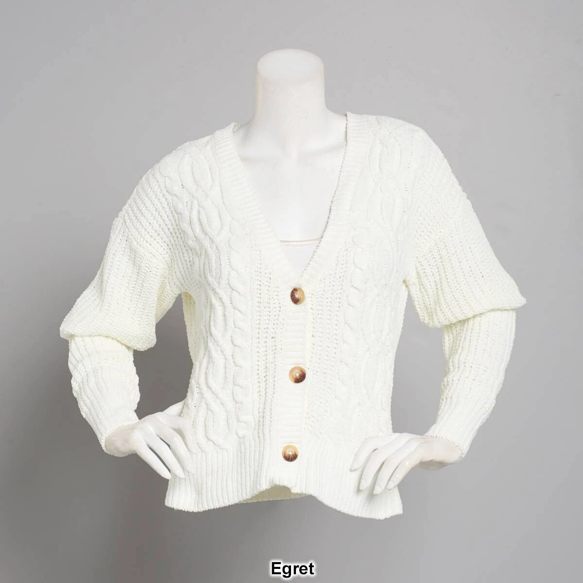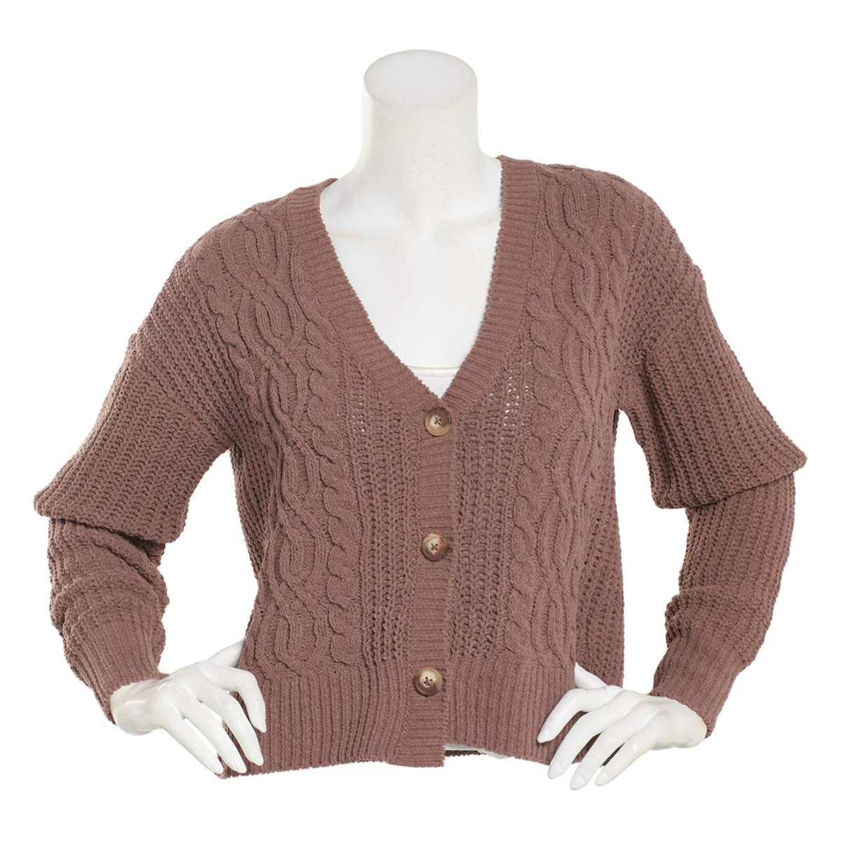Layer this Juniors Derek Heart cable knit cropped cardigan sweater with any top or cami for a stylish look. This solid sweater features a v-neckline, button front, and long sleeves.