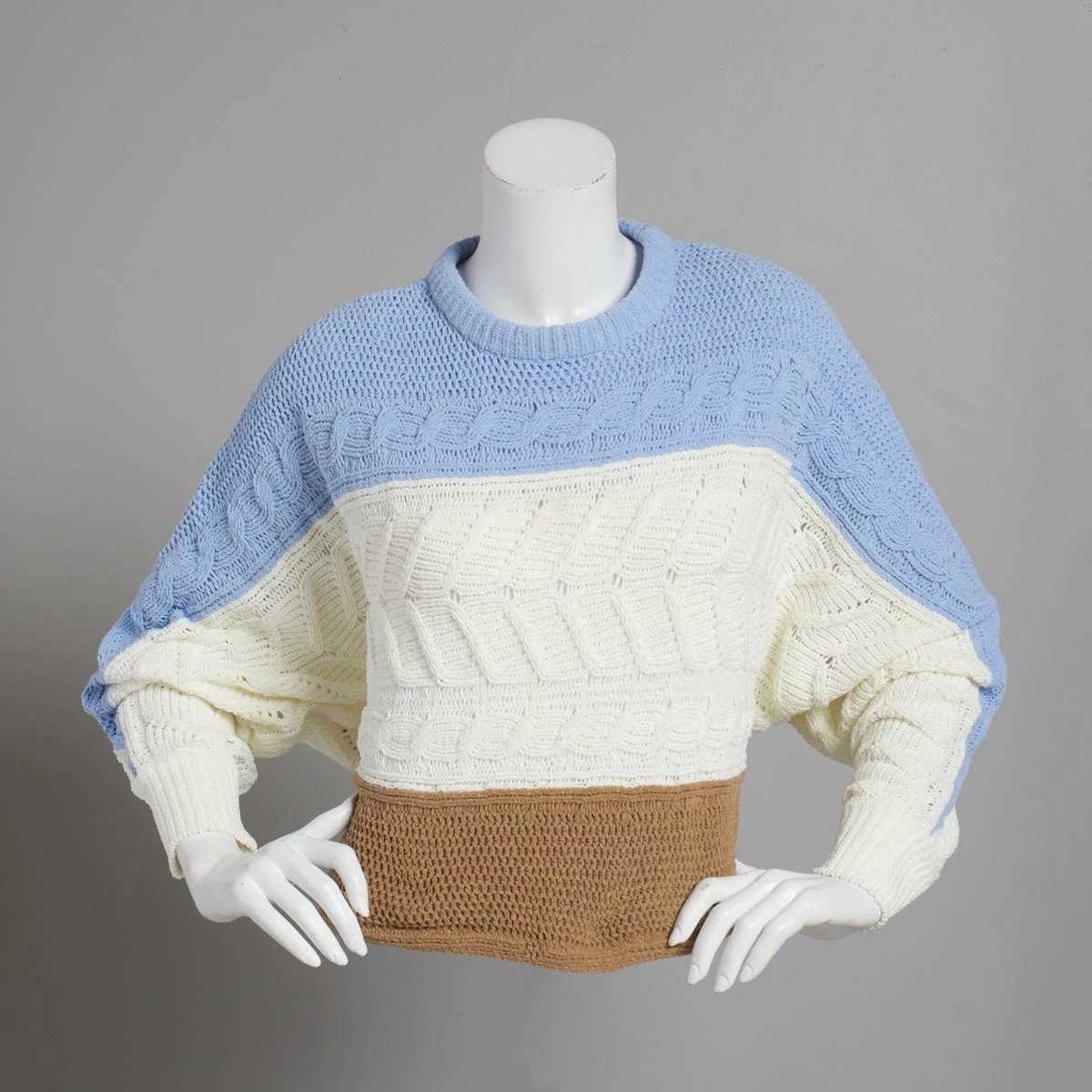 Cozy and classic, you’ll love this pullover sweater from Juniors Derek Heart matte chenille color block cable sweater that features a crew neckline and long dolman sleeves.