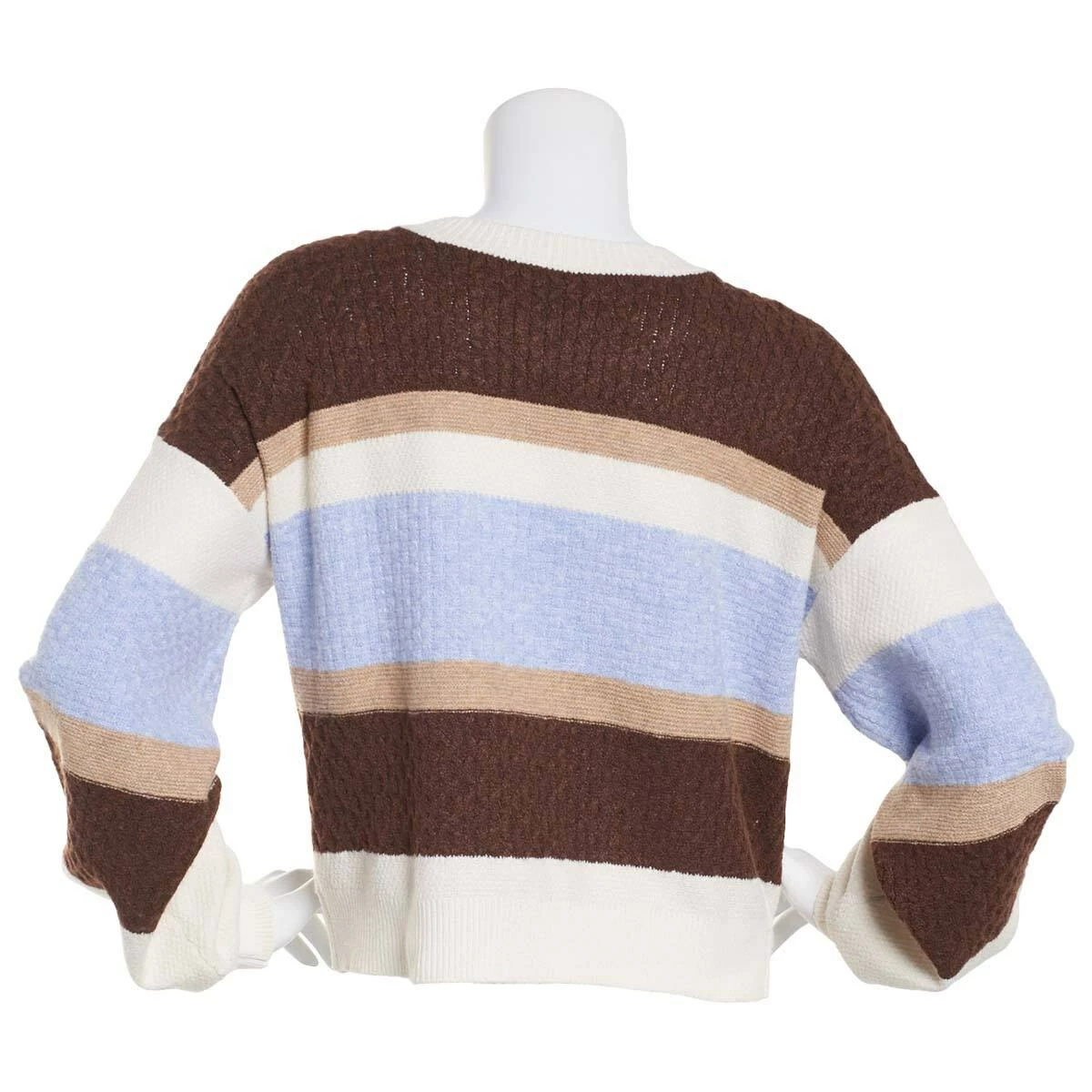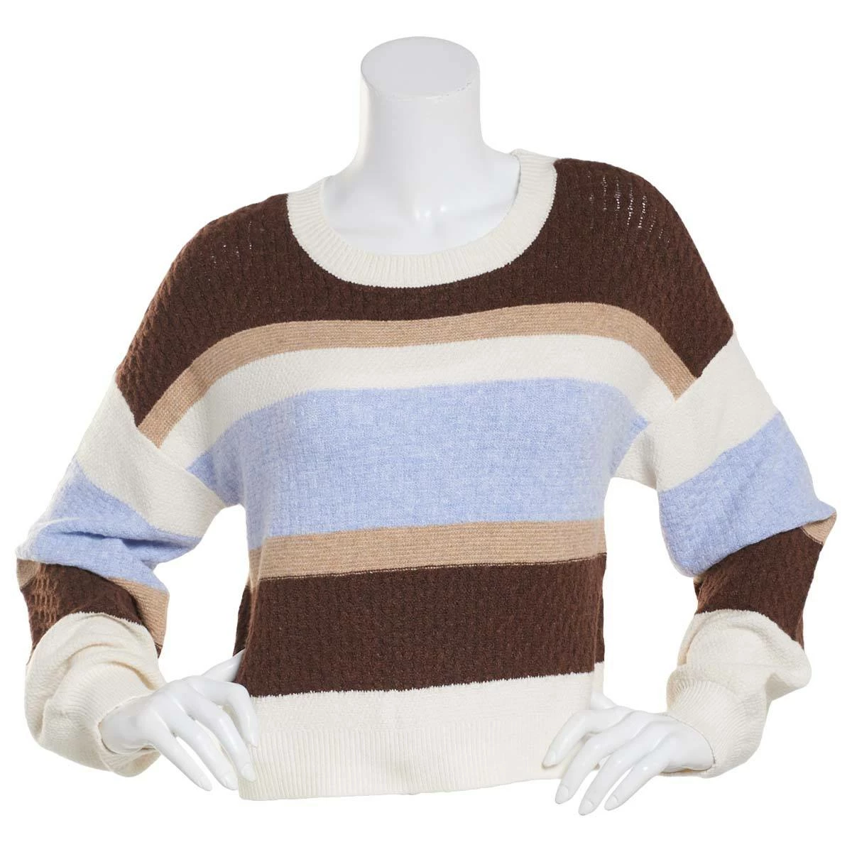 We’re head-over-heels for this Juniors Derek Heart color blocked stripe balloon sleeve pullover sweater with ribbed trim and long balloon sleeves.