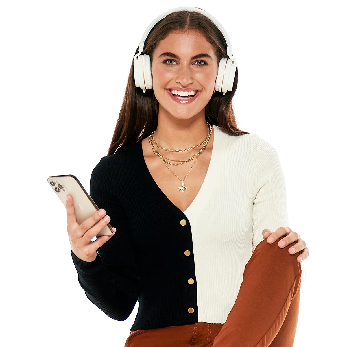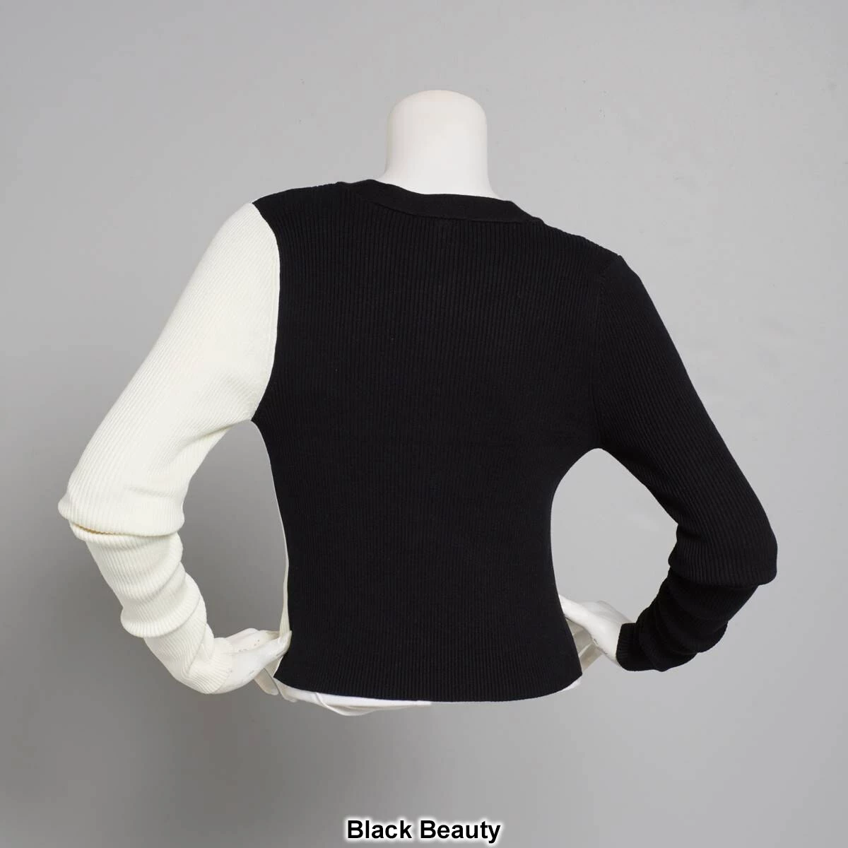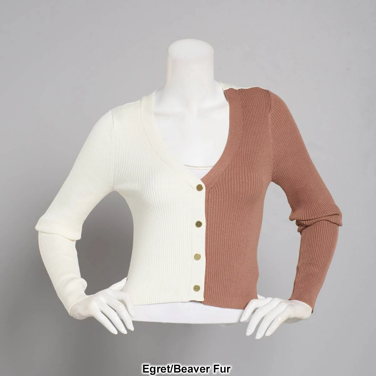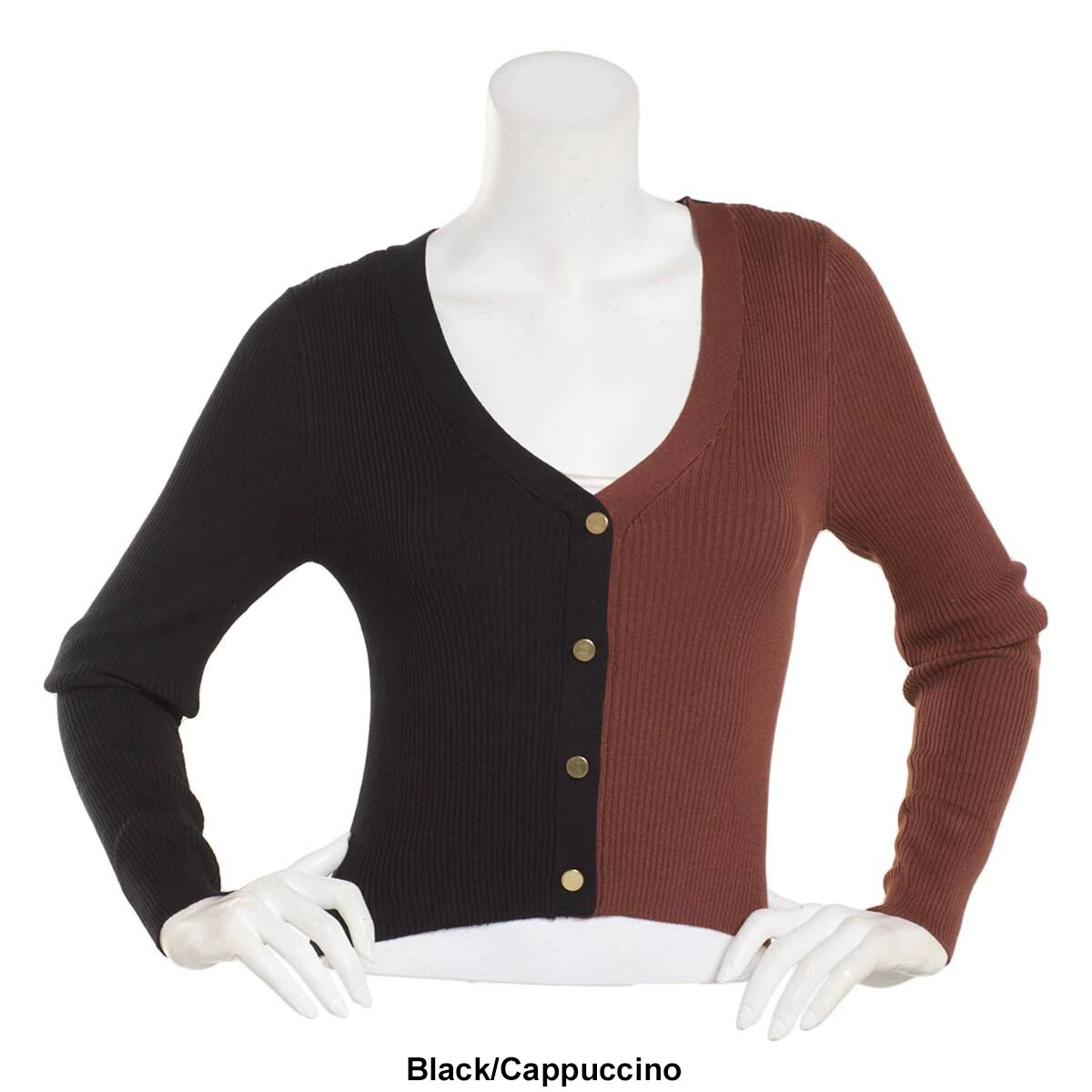 Layer this Juniors Derek Heart two-tone sweater with a cami for a chic and cozy style. This sweater features a button front, v-neckline, long sleeves, and a ribbed design.