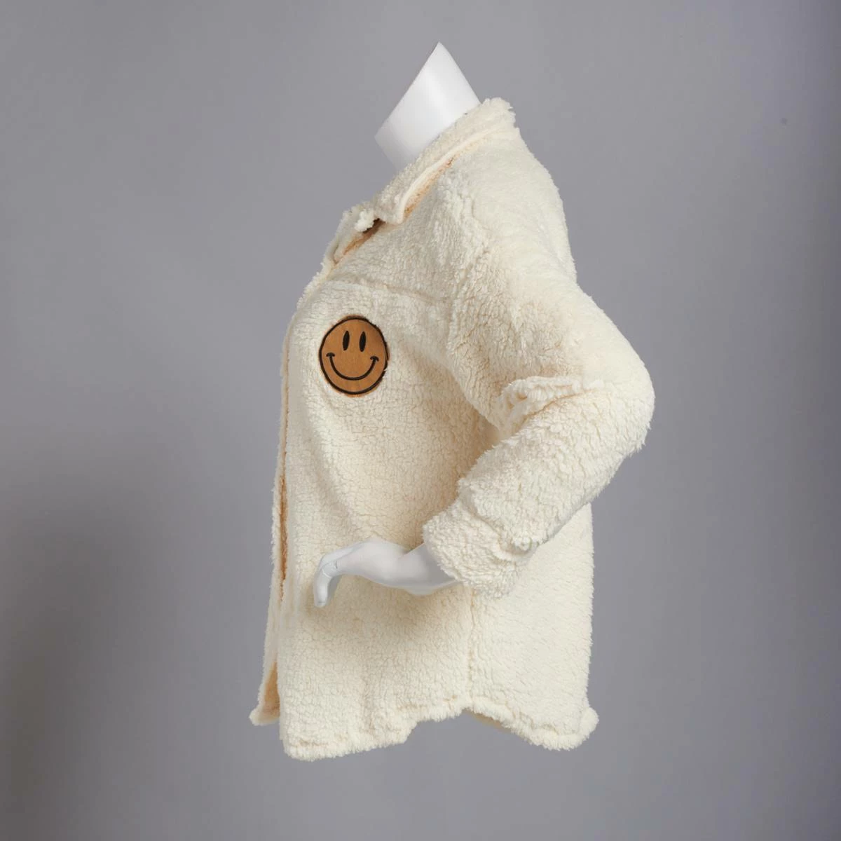 Stay warm and cozy with this Juniors Derek Heart faux sherpa oversized shacket features a button front, a smiling face design, and long sleeves.