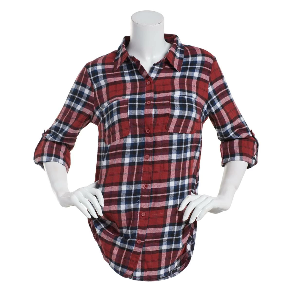 A classic addition to your casual closet with this Juniors Derek heart side tab tunic. This plaid flannel is casual buttonw down made with soft cotton and adjustable sleeves for coveted comfort. Wear it buttoned as a top or layered over tanks for endless styling options.