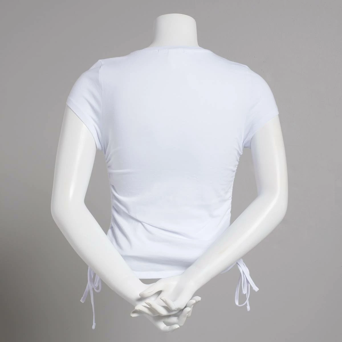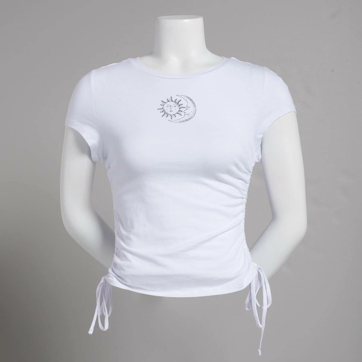 Style this Juniors Derek Heart short sleeve crew neck side ruched sun moon graphic tee alone or under a sweater for endless styling options day or night.
