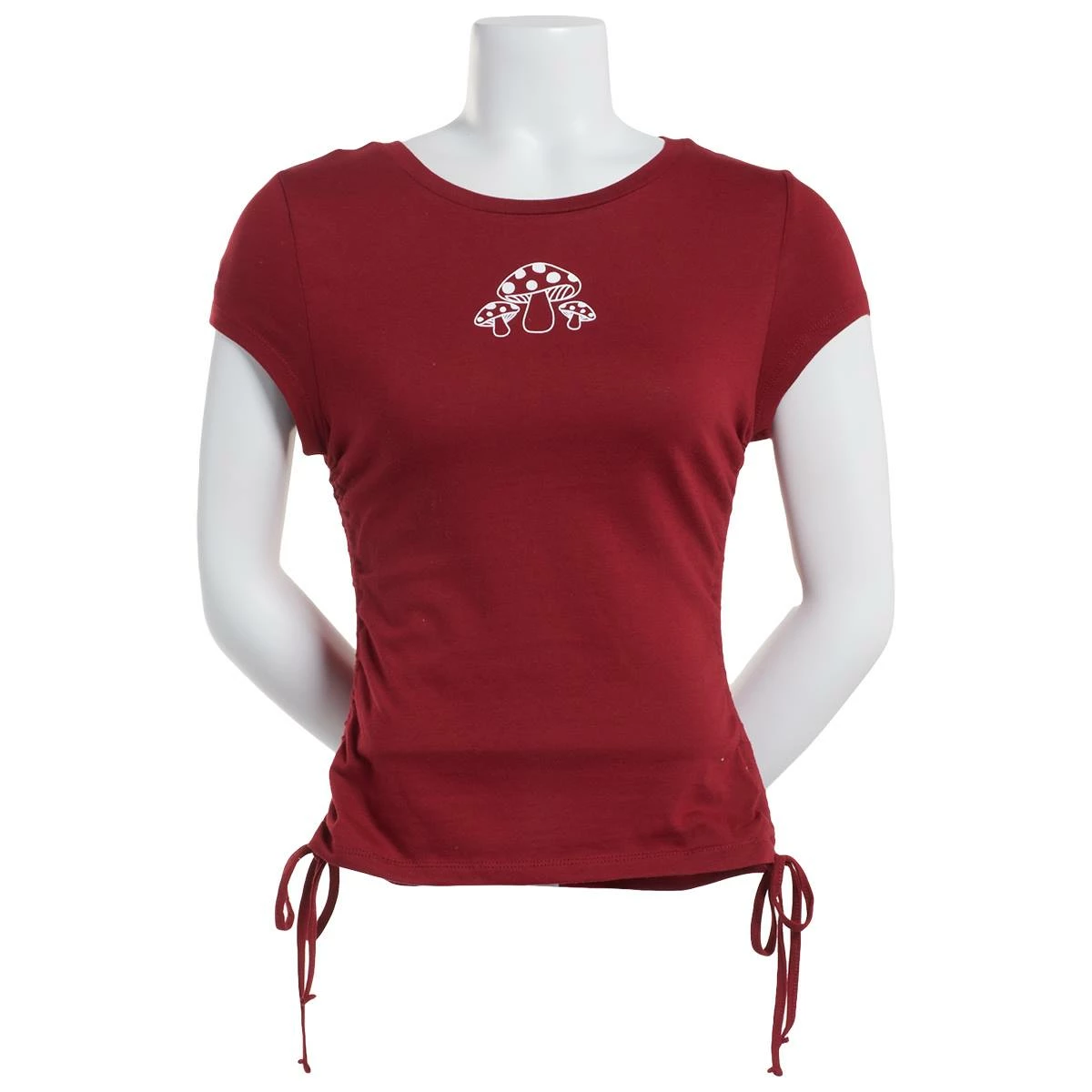 Have fun with your everyday look wearing this Juniors Derek Heart mushroom graphic top.