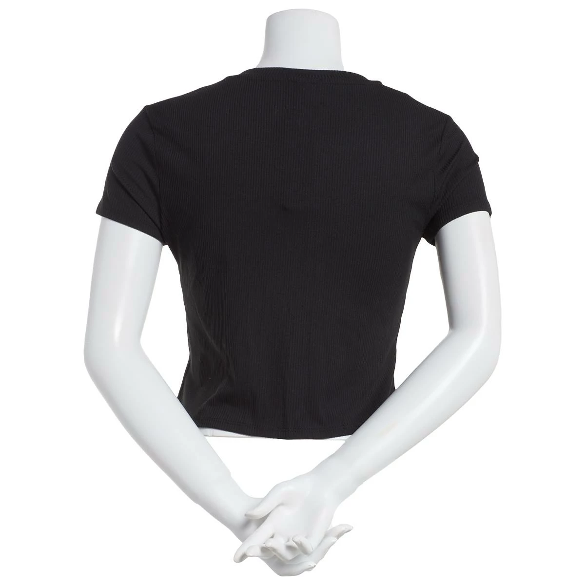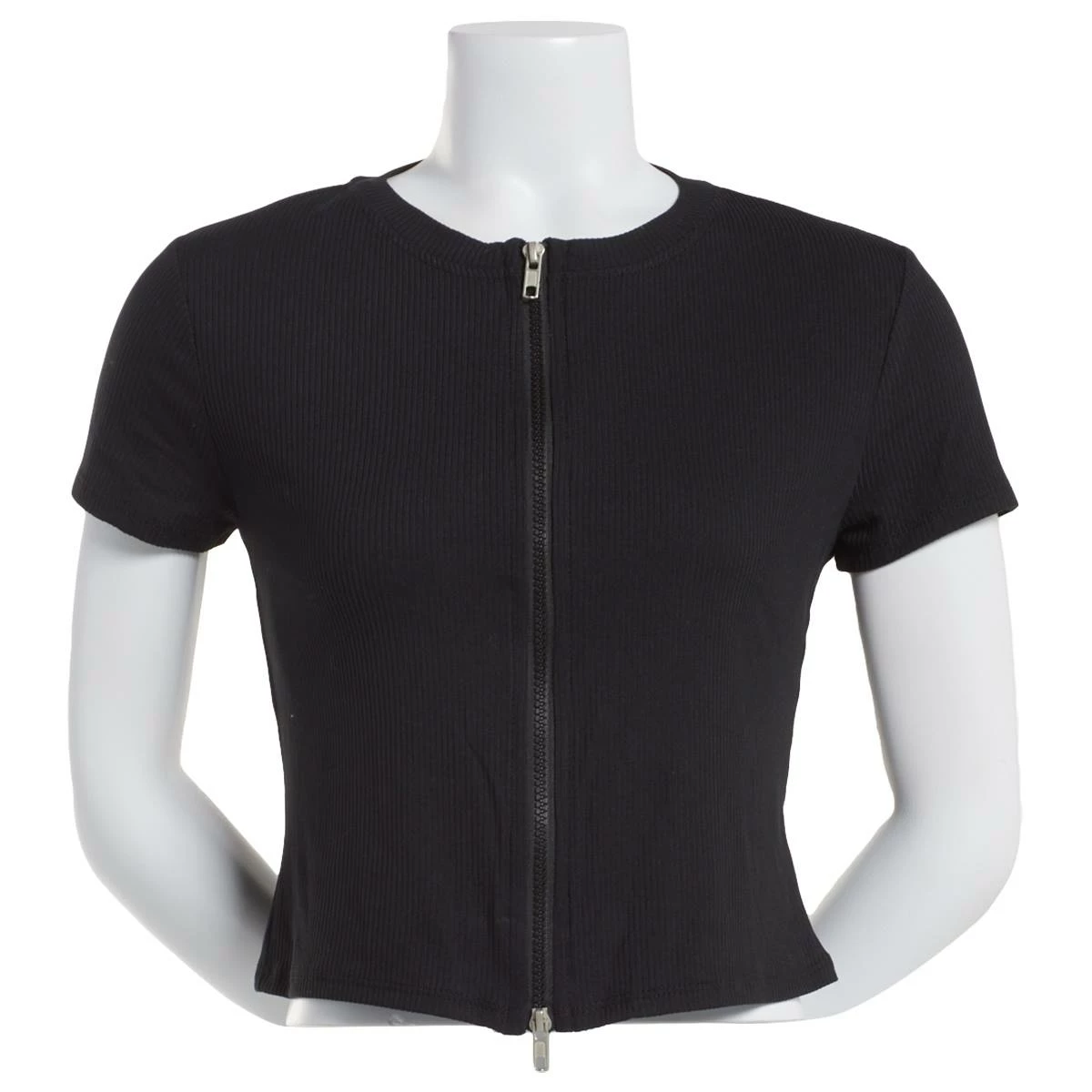 With a cool zip front, this Juniors Derek Heart short sleeve yummie rib 2 way zip top will be a fun addition to your wardrobe.