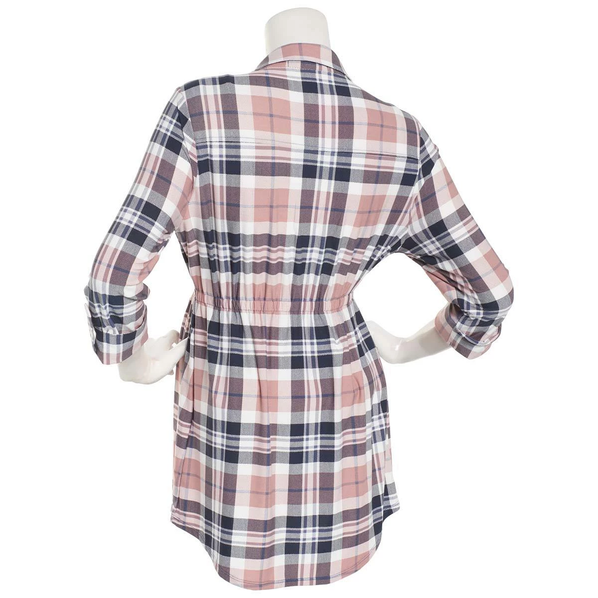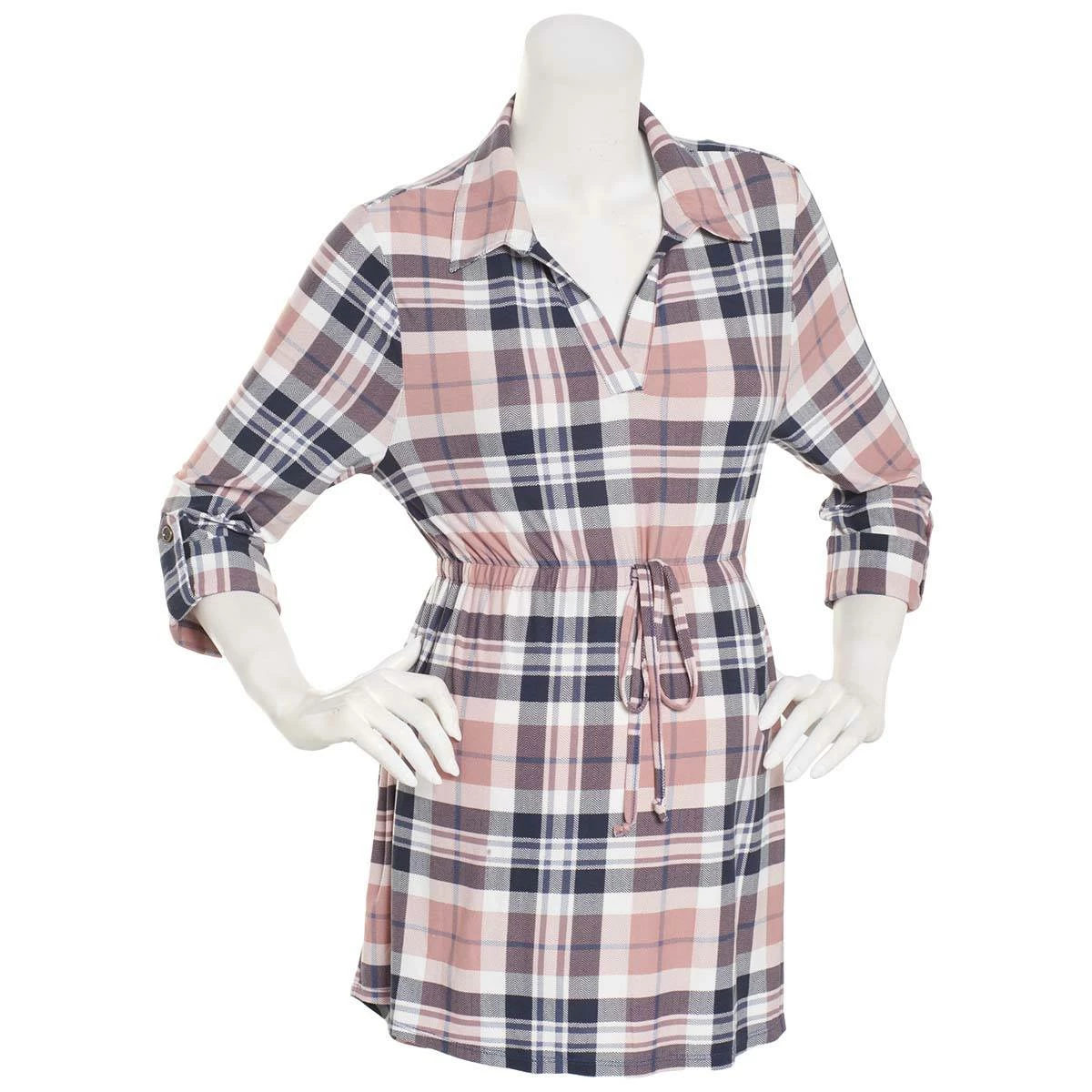 The Womens Derek Heart Maternity tunic top allows plenty of room for a growing bump. Featuring a bold, plaid print, a split neckline, and 3/4 roll tab sleeves, you are sure to feel comfortable and look stylish.