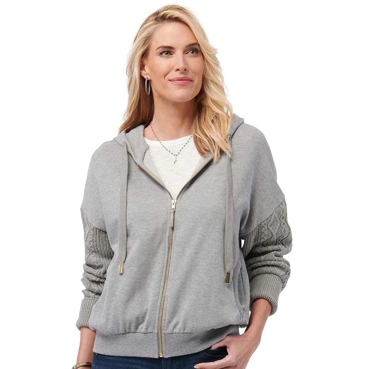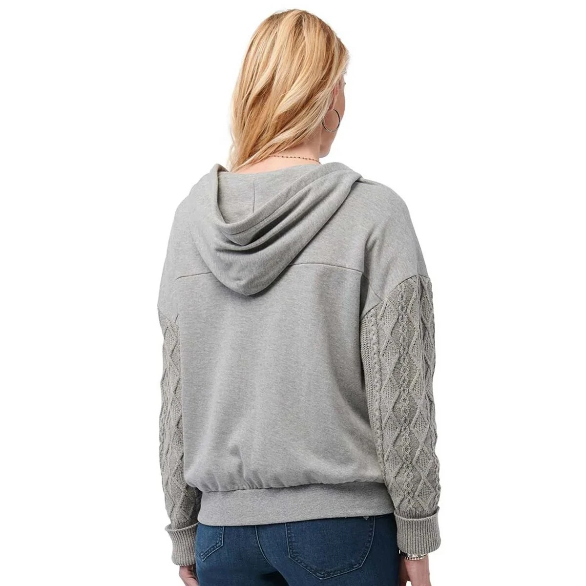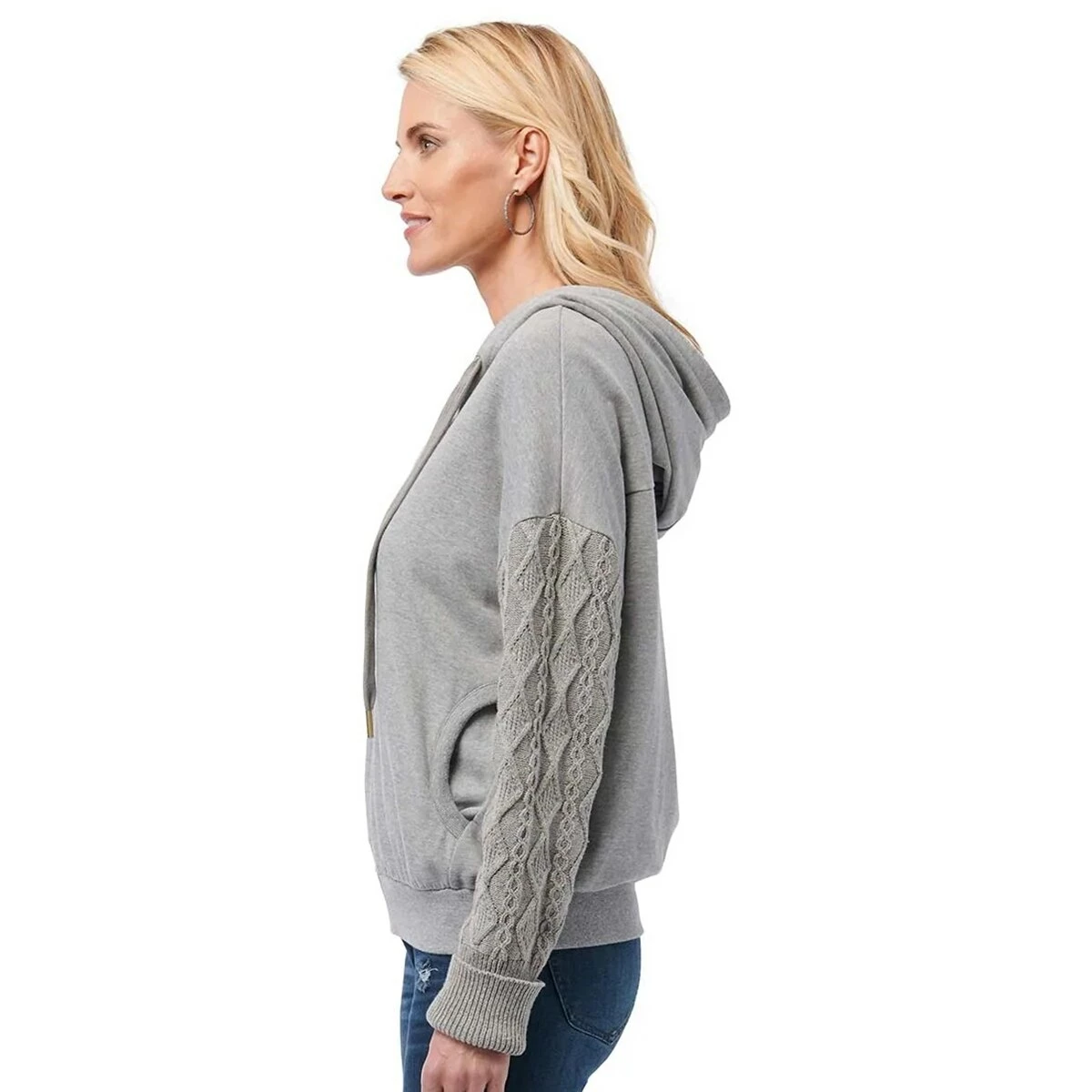 This classic Womens Democracy hoodie sweatshirt gets an update with a cable stitch design down the long blouson sleeves, french terry knit construction, and zip-up front closure.