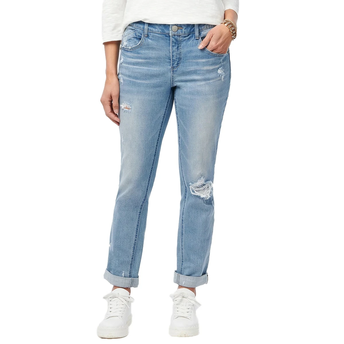 These relaxed wear everyday Womens Democracy “Ab”solution® girlfriend stretch jeans, boast a lived-in look courtesy of the hand sanding details, whiskering, and subtle destruction as well as the light blue vintage-inspired wash. They offer an exceptionally amazing fit thanks to our exclusive mold-and-hold fit technology. Boyfriend styling that is fit for your curves.