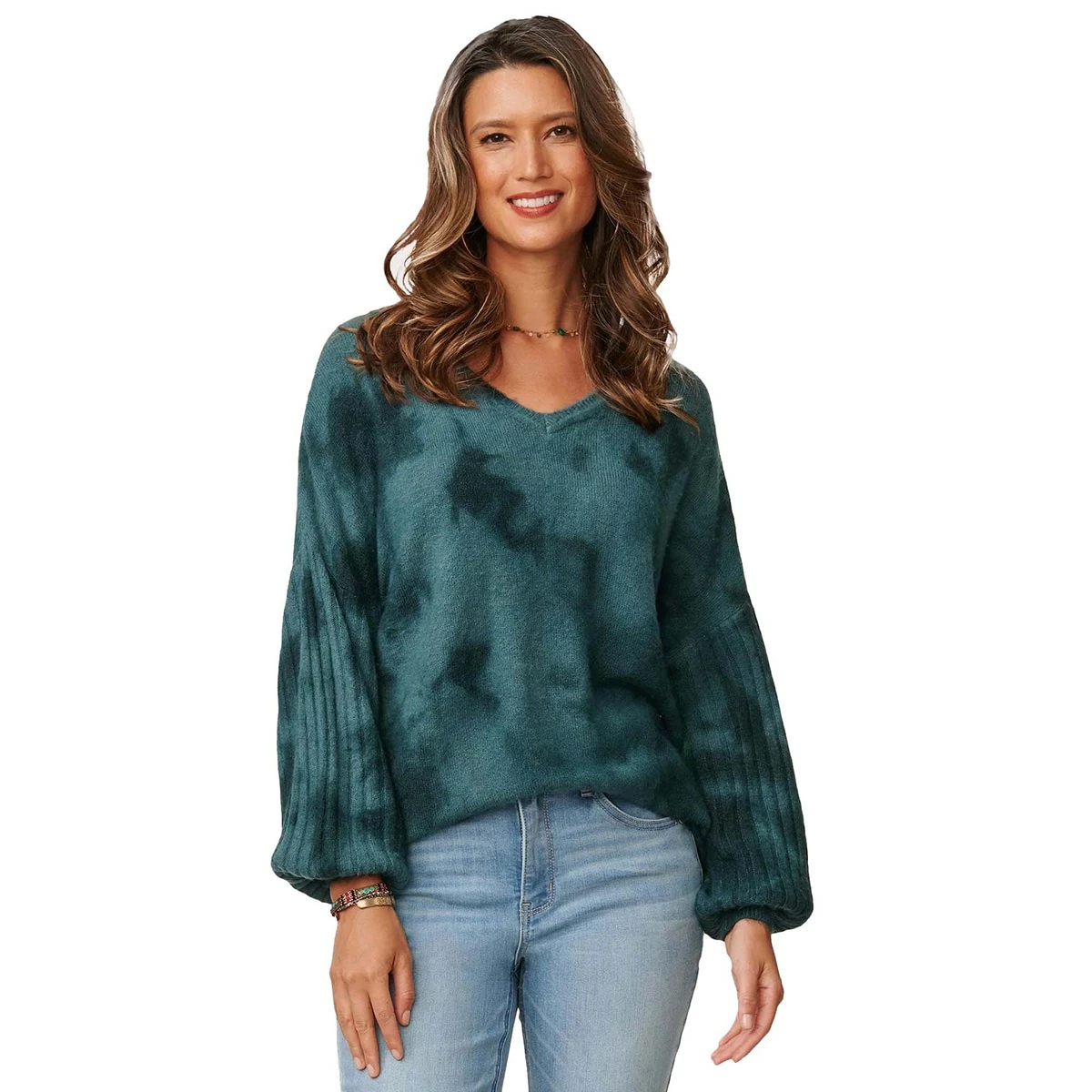 Add extra style to your casual look with this soft and fuzzy lightweight construction, Petite Democracy tie dye sweater.