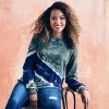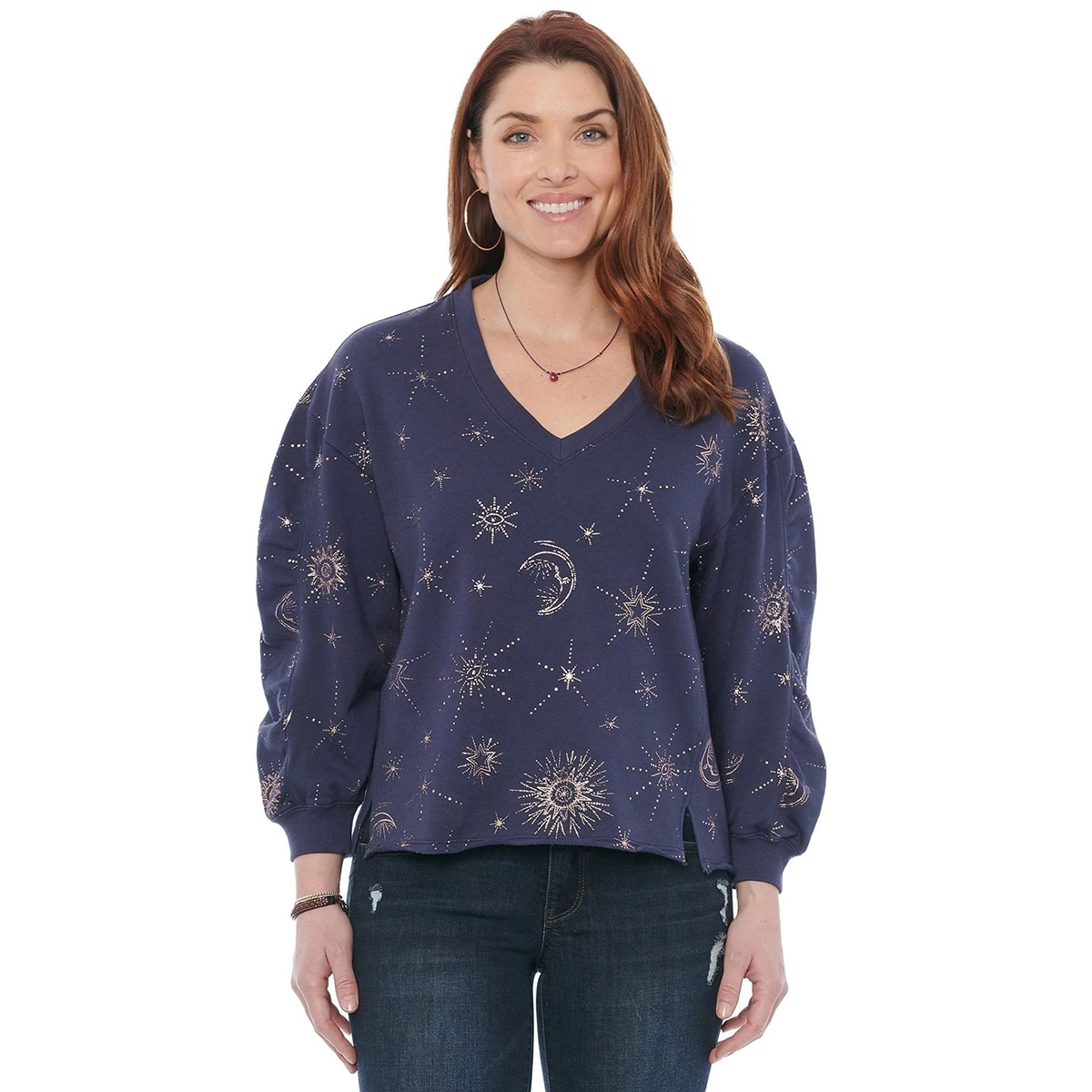 This Womens Democracy celestial foil sweater offers both comfort and style. This features long ruched sleeves, v neckline, side slit and stars prints.