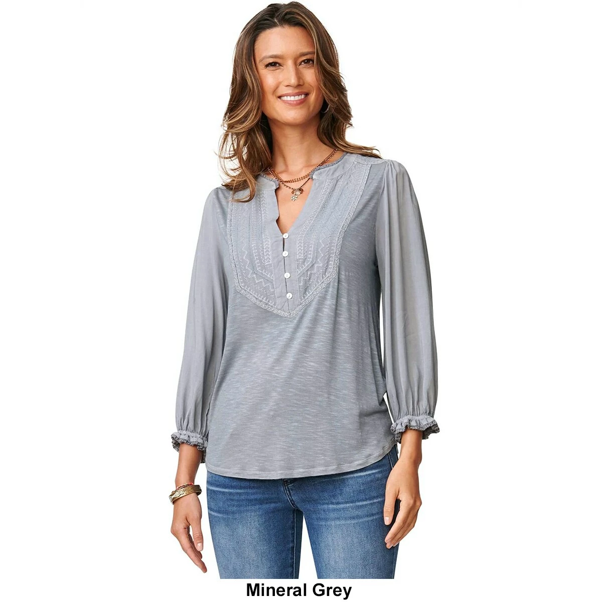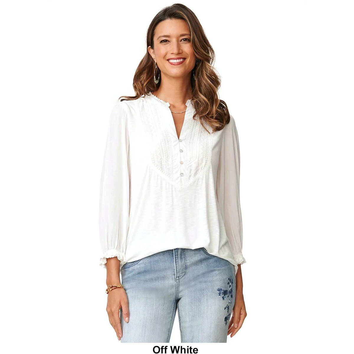 Elevate your look for the season with this Womens Democracy 3/4 blouson sleeve mix media blouse.