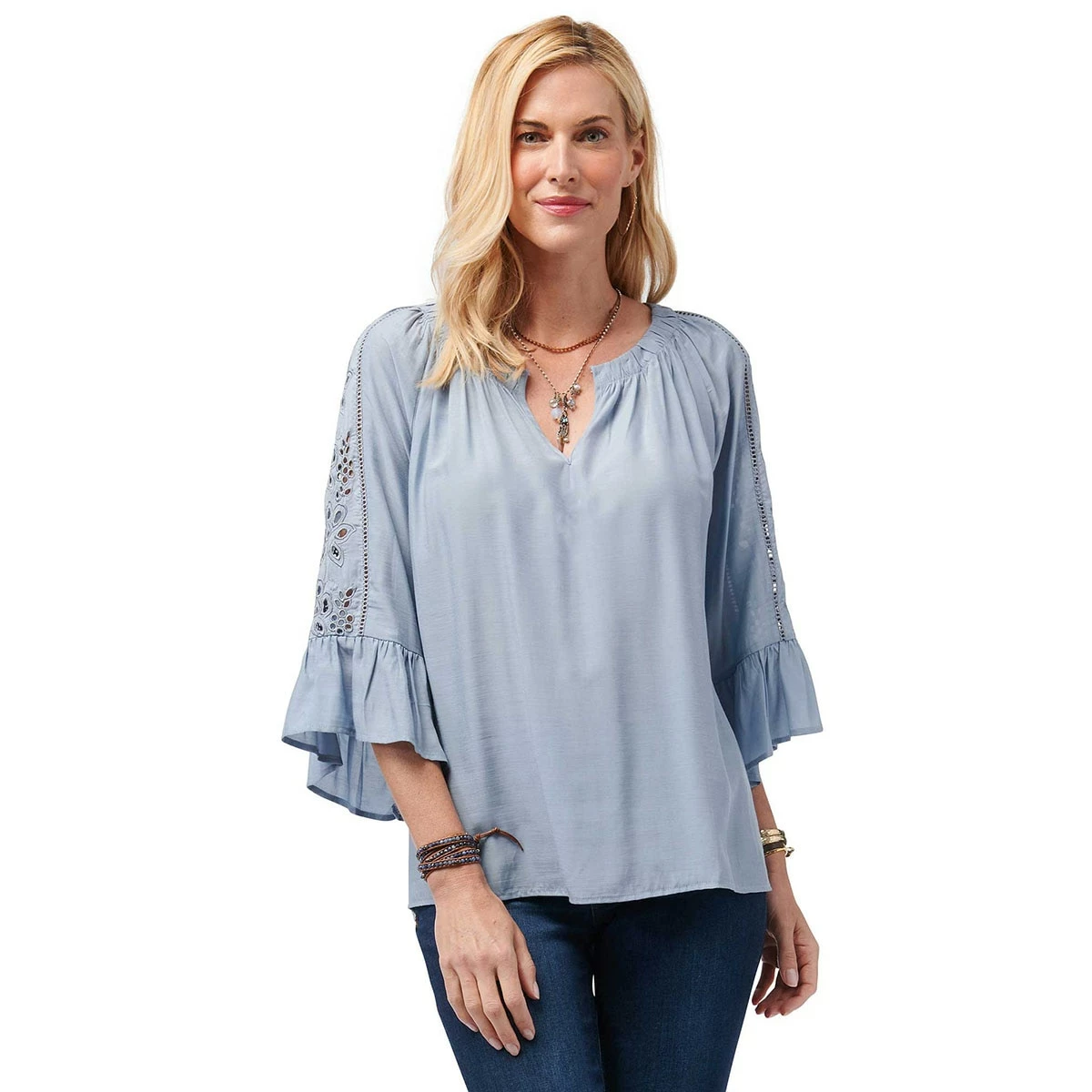 Easily transition from day to night with this Womens Democracy blouse designed with a flowy relaxed fit, beautiful floral embroidery cascading down the 3/4-length bell sleeves, and a split hem. Wear it as a mock neck with the hook and bar closure or an open notch v-neck.