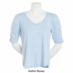 This Womens Democracy heather jersey-knit fashion top features a lightweight feel and is designed with a scoop neck, elbow-length ruched puff sleeves, and a high-low shirttail hem.