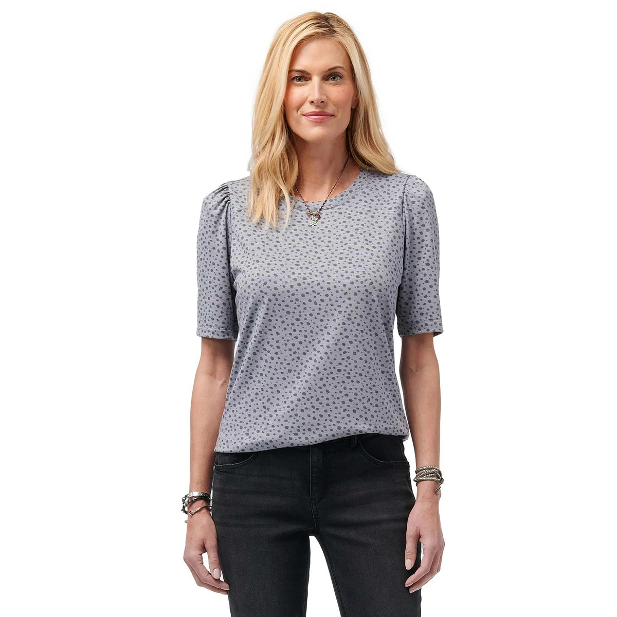 Add feminine charm to your everyday look with this Womens Democracy elbow puff sleeve top that features a crew neckline with dotimal prints.