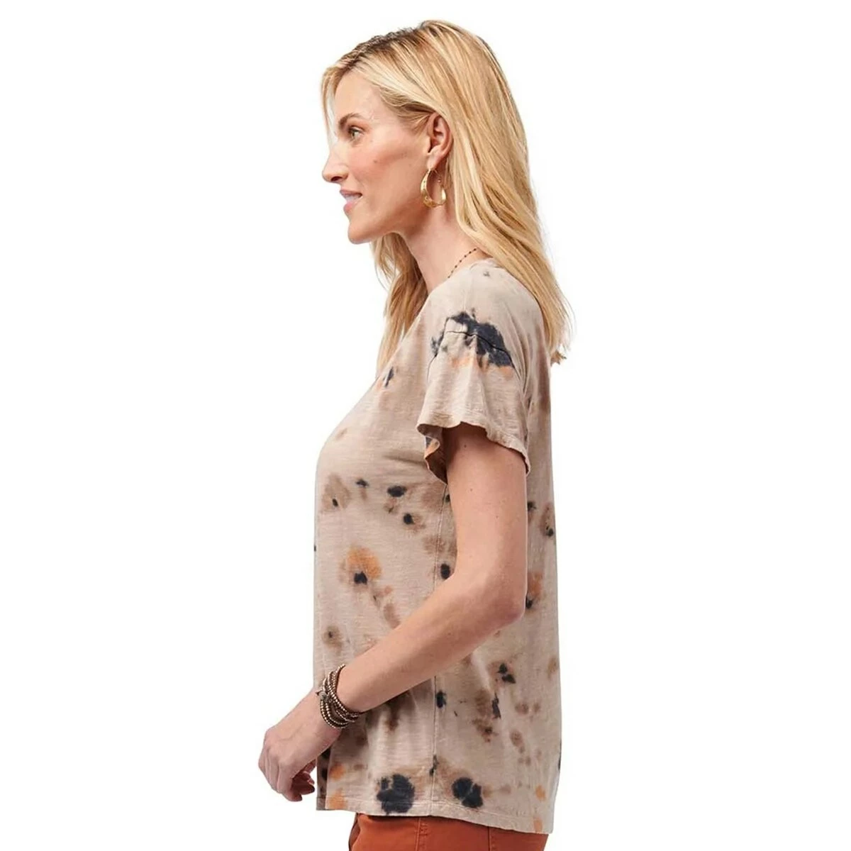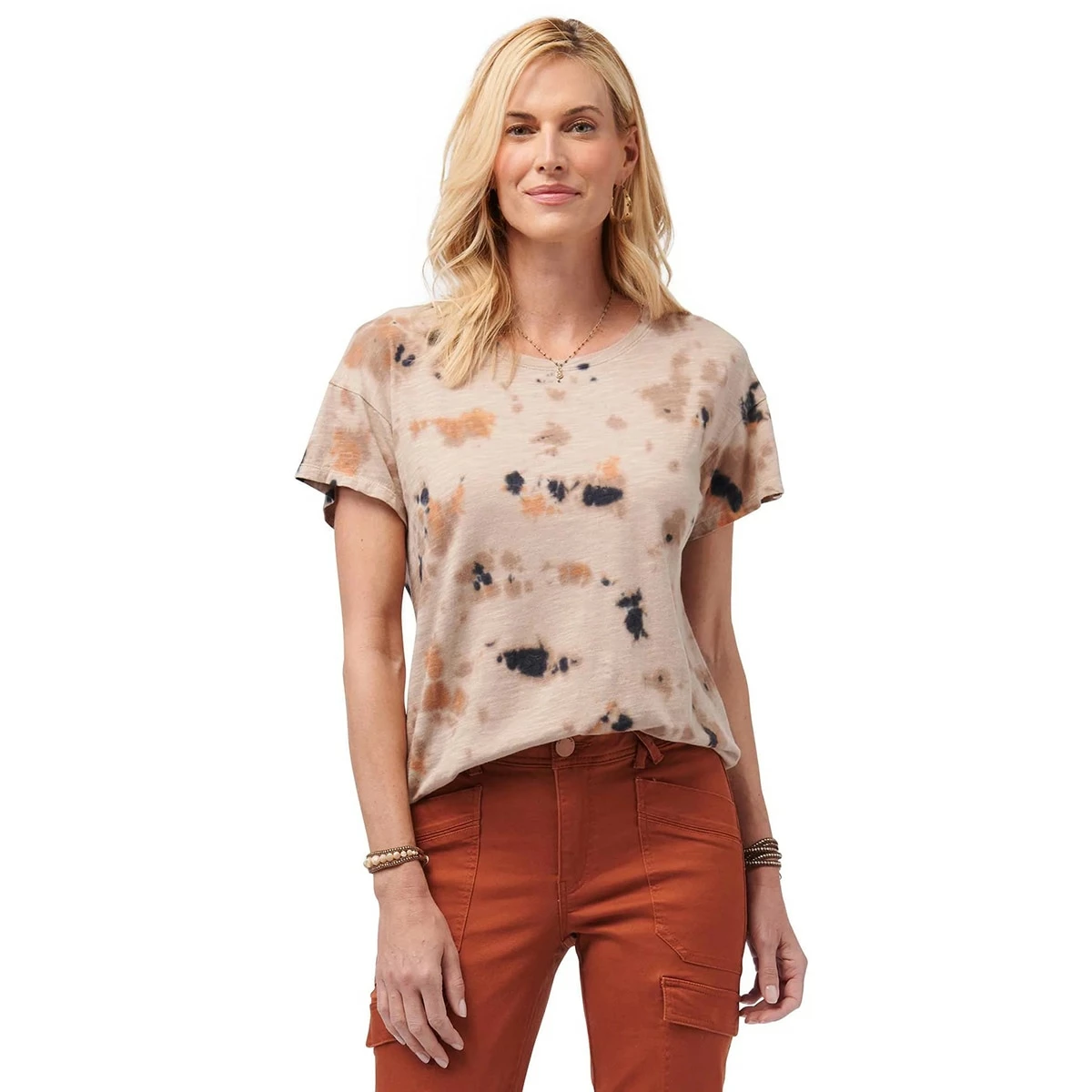 Add a fun pop of color to your wardrobe with this Womens Democracy super-soft jersey knit tee featuring a groovy tie-dye design, scoop neck, and straight hem.